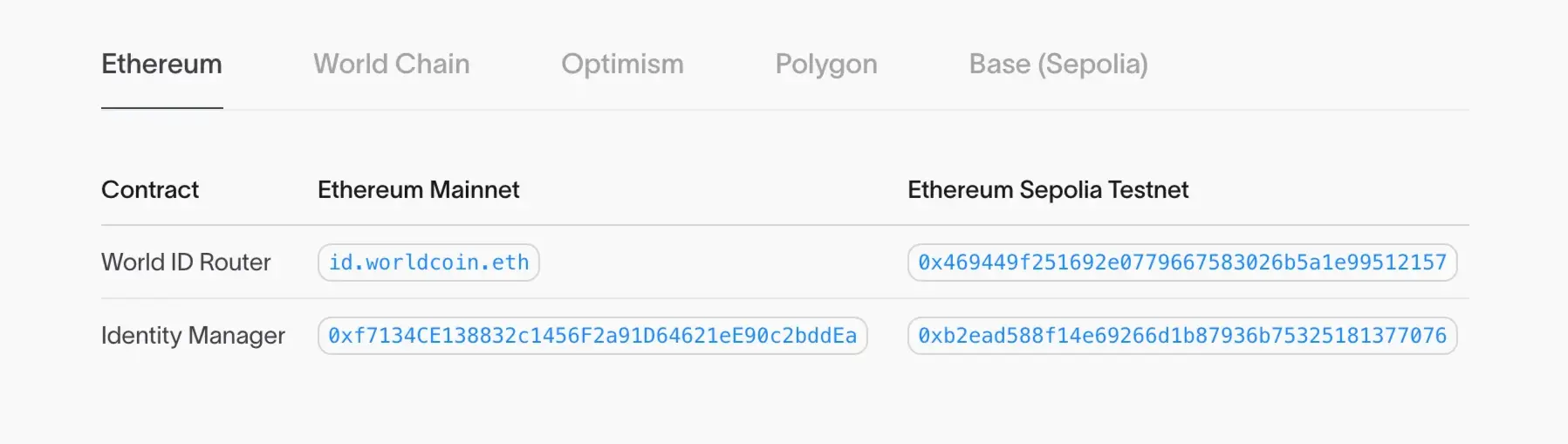 World brings the same practice to its smart contracts, maintaining a public address book that lists each deployment alongside a corresponding ENS name. This address book includes multiple networks: On Ethereum mainnet the router resolves at id.worldcoin.eth, on Optimism it is optimism.id.worldcoin.eth, and on Polygon it’s polygon.id.worldcoin.eth.